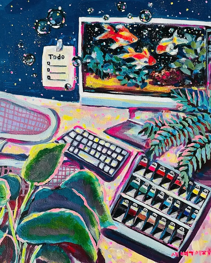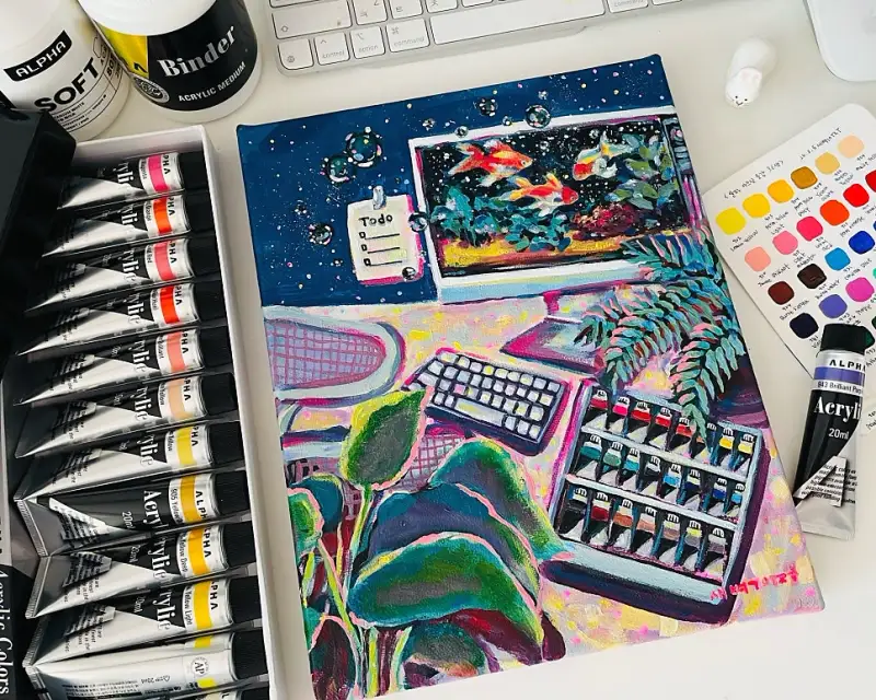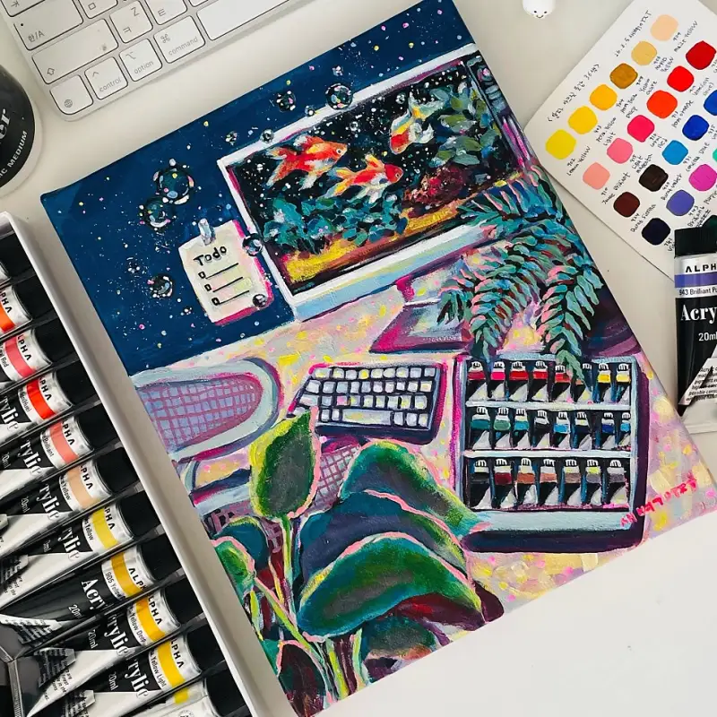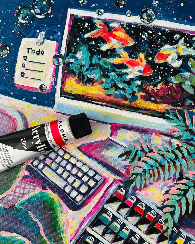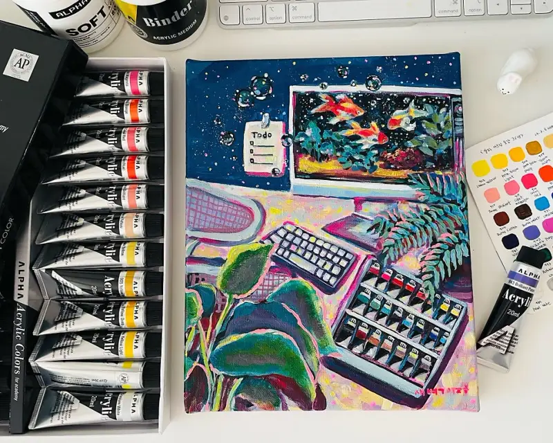 알파 아크릴물감으로 금붕어가 있는 그림작업실 그리기