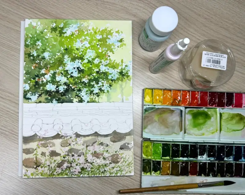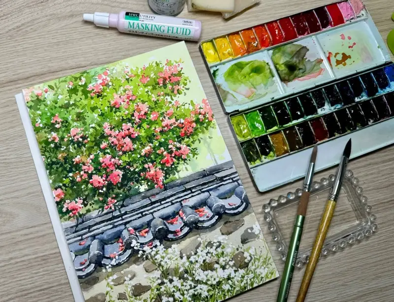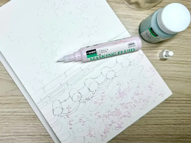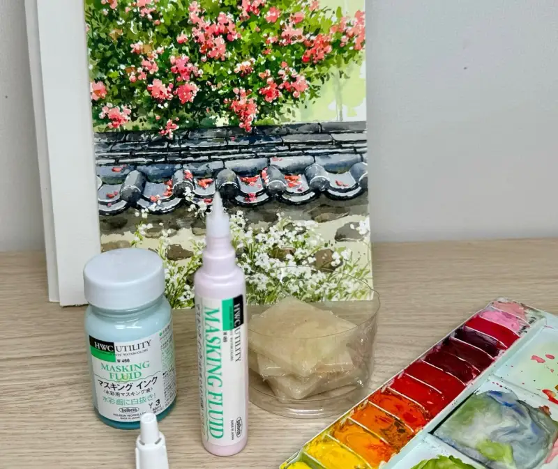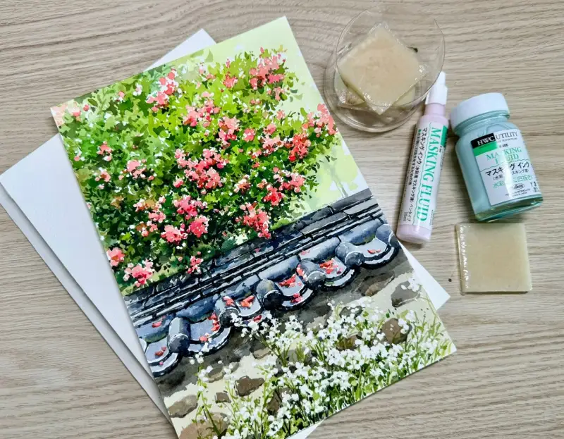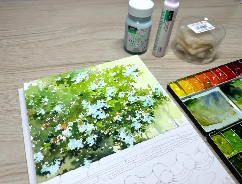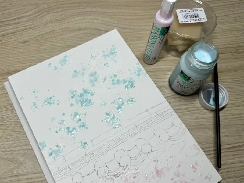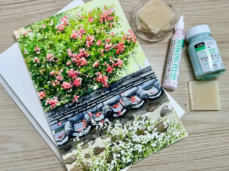 ๋งˆ์Šคํ‚น ์ž‰ํฌ๋กœ ๊ฝƒ์„ ๊ทธ๋ฆฐ ๋‹ค์Œ ๋‚˜๋จธ์ง€ ๋ฐฐ๊ฒฝ์„ ์ฑ„์ƒ‰ํ•˜๋ฉด ํ›จ์”ฌ ์‰ฝ๊ฒŒ ํ‘œํ˜„ํ•  ์ˆ˜ ์žˆ์–ด์„œ ๊ฝƒ๋“ค์˜ ๋ชจ์–‘์„ ์‚ด๋ ค์„œ ๋งˆ์Šคํ‚นํ–ˆ์–ด์š”.