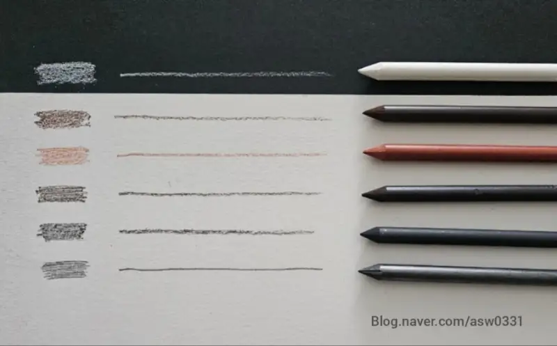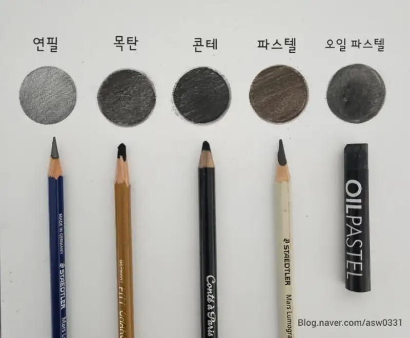 비슷한 성질의 건식 재료 연필, 목탄, 콘테, 연필파스텔, 오일파스텔을 비교해 보았어요.