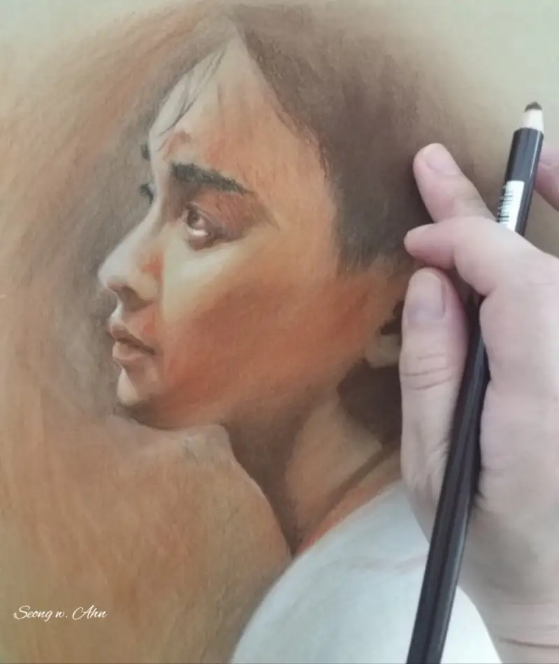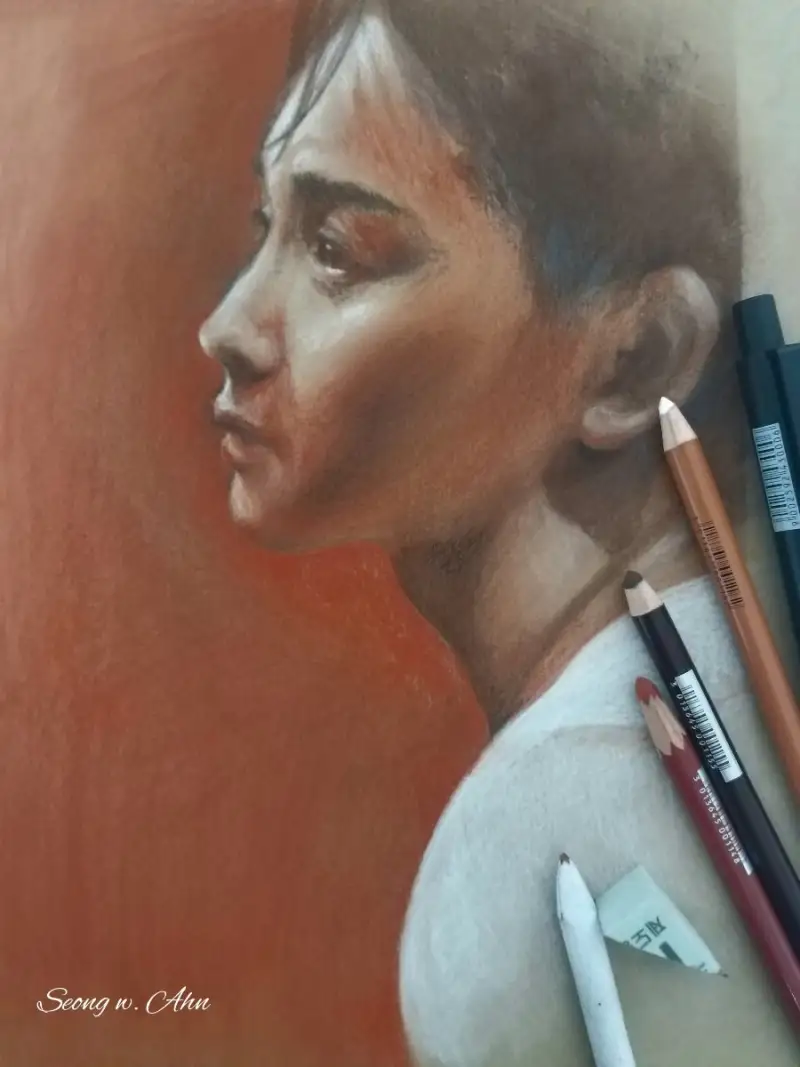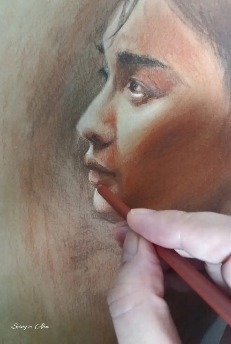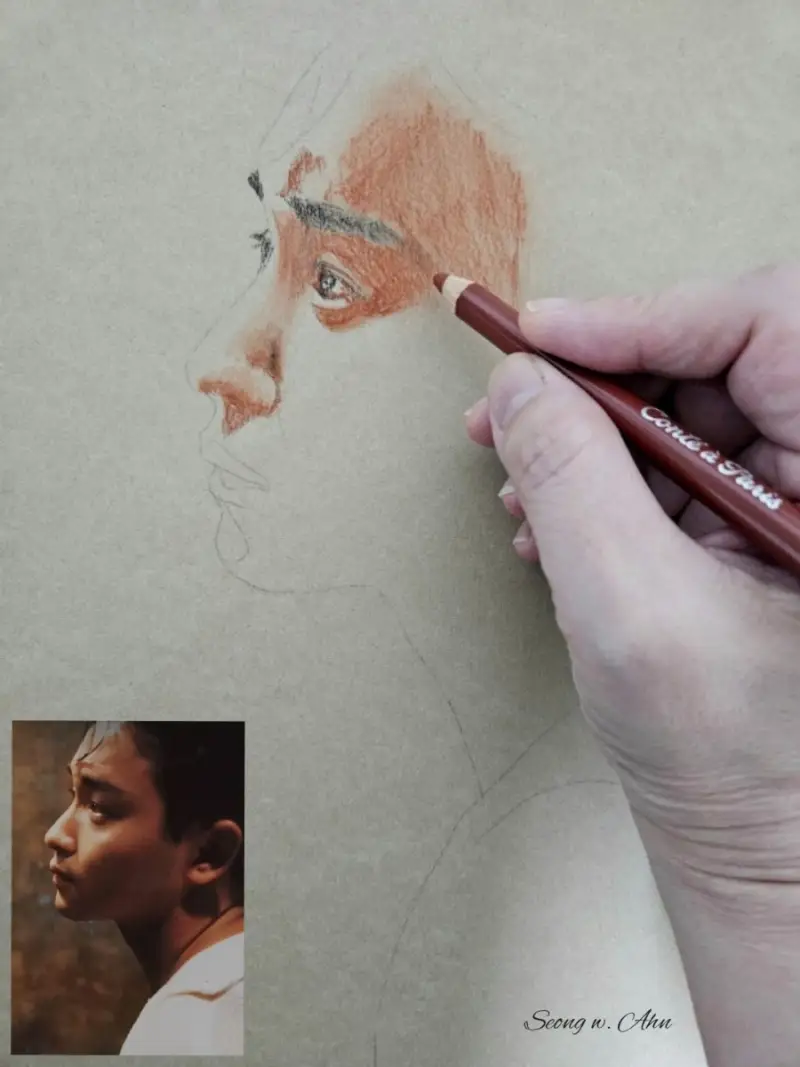 얇은 심과 굵은 콘테아파리의 연필콘테를 적절히 섞어 사용하니 같은 굵기 한가지로 그리는 것보다 속도가 빨라요.