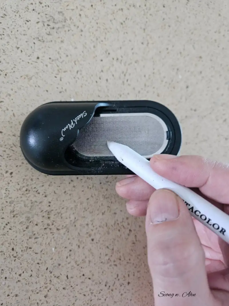더러워지면 칼로 깎거나 사초로 심을 갈아내고 다시 쓰면 되는데 연필심 끝을 갈때 쓰는 심갈이에 찰필 끝을 갈아서 써도