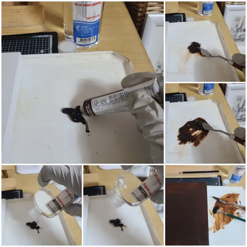 🎨유화를 처음 접하는 분들은 캔버스에 젯소칠하는데 저는 번트엄버로 빽칠합니다. 이때 물감에 페트롤을 섞어 빽칠하는데 휘발성이 있어 속히 마릅니다.