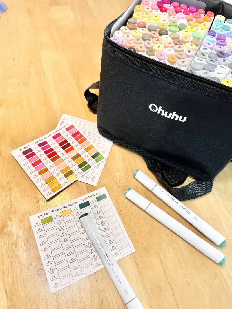케이스는 보관과 휴대가 간편하도록 천가방으로 되어있고 번짐 방지패드가 들어있어서 종이 뒷면에 깔고 작업하면 마커자국이 번지는걸 막아줍니다.