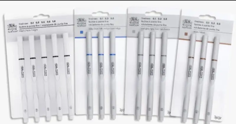 원저앤뉴튼 파인라이너 세트는 블랙 5종 세트(0.1/ 0.3/0.5/0.8/ 1.0mm)및 인디고 블루, 쿨 그레이, 세피아각3종 세트(0.1/0.3/0.5mm)로 구성되어 있습니다.