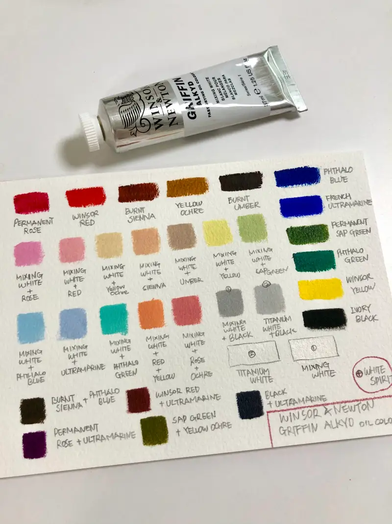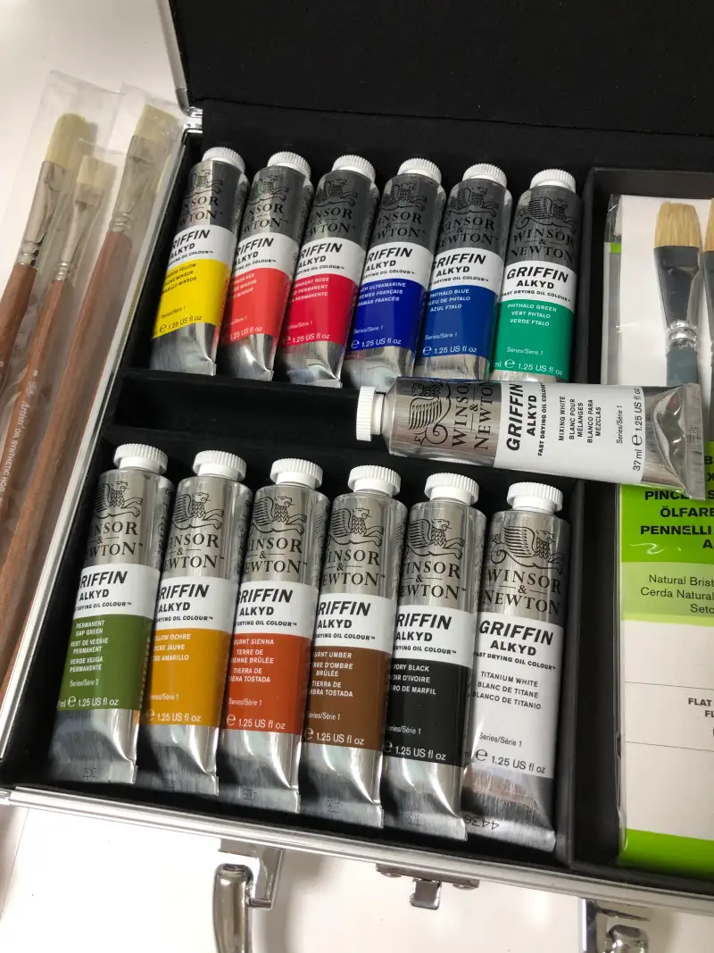 이번에 소개할 재료는 윈저앤뉴튼 그리핀 알키드 유화물감 37ml 12색 세트입니다.