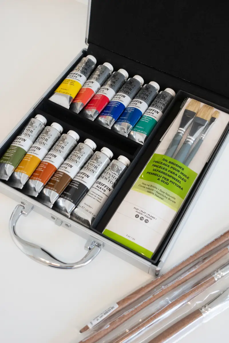 윈저앤뉴튼의 그리핀 컬러는 안료의 용매로 알키드 수지를 혼합하여 만든 물감으로, 알키드 수지 기반의 보조제를 추가로 섞지 않아도 되는 편리한 물감입니다.
