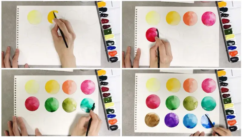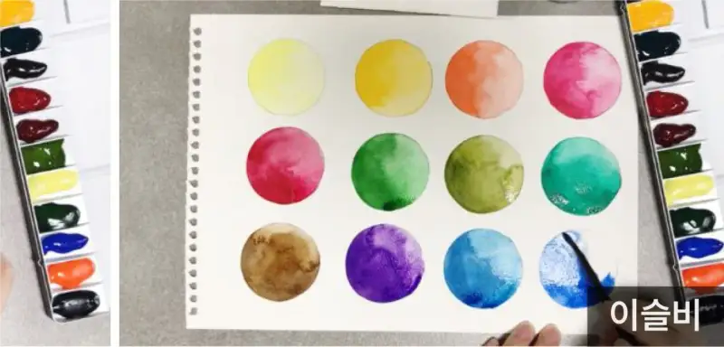 안녕하세요 이웃님들 ^^ 오늘은 저번 글에서 소개해드린 윈저앤뉴튼 수채화물감 컬러차트를 보여드리려고 해요 :) 작게 하는것 보다는 크게크게 번지는 색감이나 느낌을 보여드리고 싶어서 동그라미 모양으로 크게 그렸습니다 킄크 ㅎㅎ -윈저앤뉴튼 아티스트 프로페셔널 수채화물감 14ml 12색 B세트