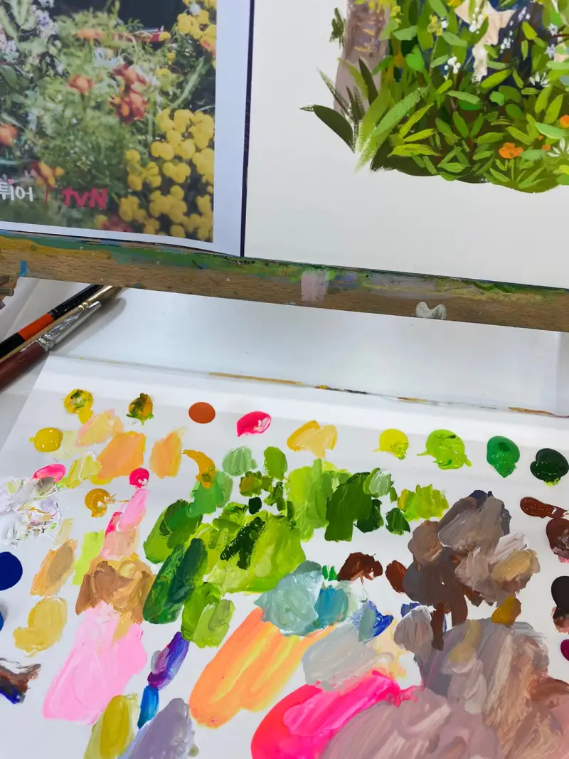 조색도 자유롭게 가능하며 색이 다양하게 있어서 조색이 쉬웠어요. 평소 수채화를 자주 다루는 편인데 수채화의 조색법대로 가도 원하는 색이 나왔어요. 단, 아크릴과 과슈의 특성상 밝은 색은 흰색 물감으로 명도를 올려 줄 수 있었어요.
