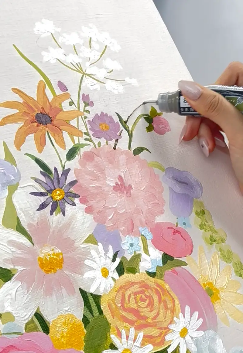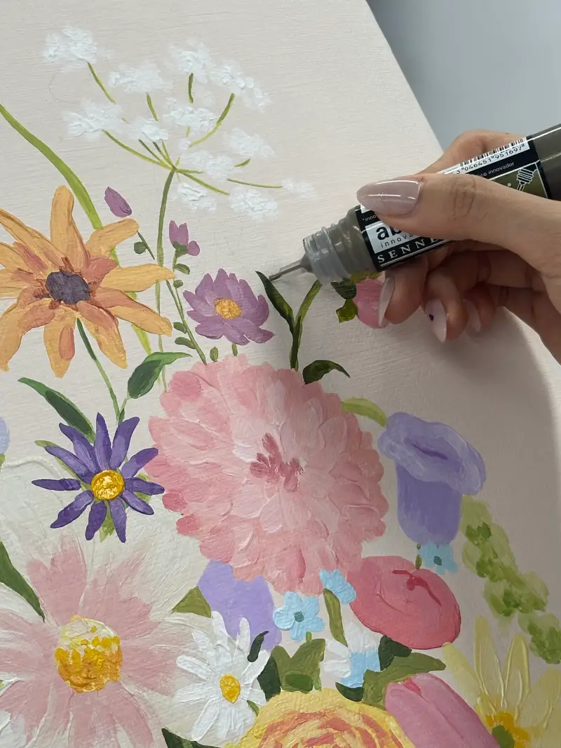 고른 힘으로 눌러주면 얇고 일정한 선이 입체적으로 그려집니다!!저는 꽃 주변에 가느다란 줄기와 꽃 중심의 포인트를 넣어봤는데, 펄감이 있어 마르고 나면 은은하게 반짝거려 영롱한 느낌이 나더라구요 ✨