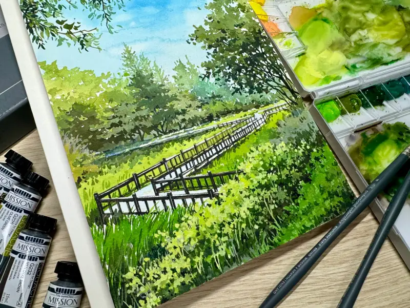 미젤로 리얼코튼 수채화종이는 튼튼해서 여러번 색을 겹치는 과슈작업에도 종이가 상하지 않기에 편안하게 작업할 수 있어요.