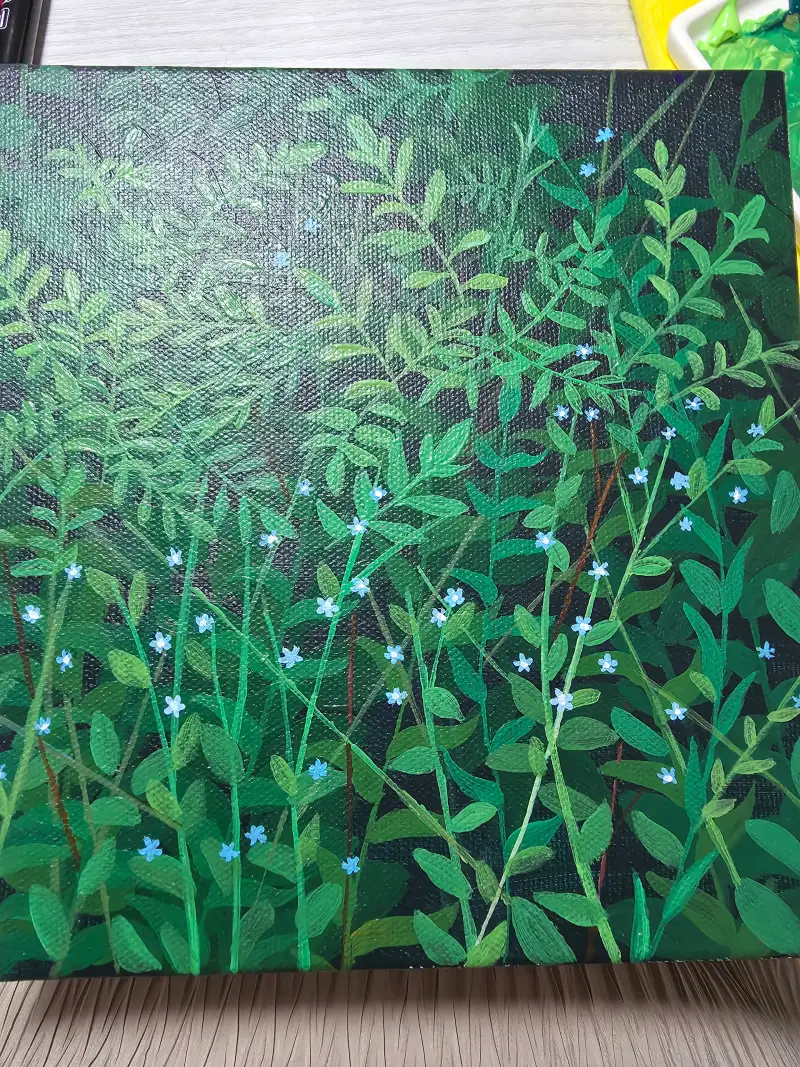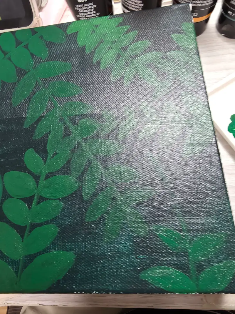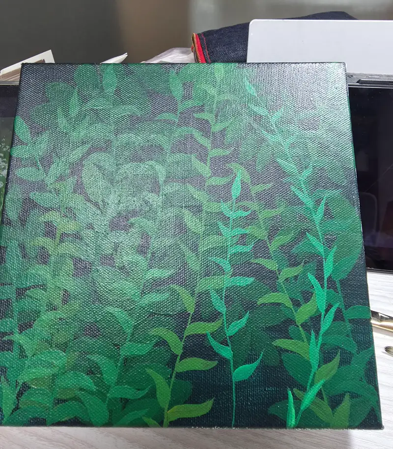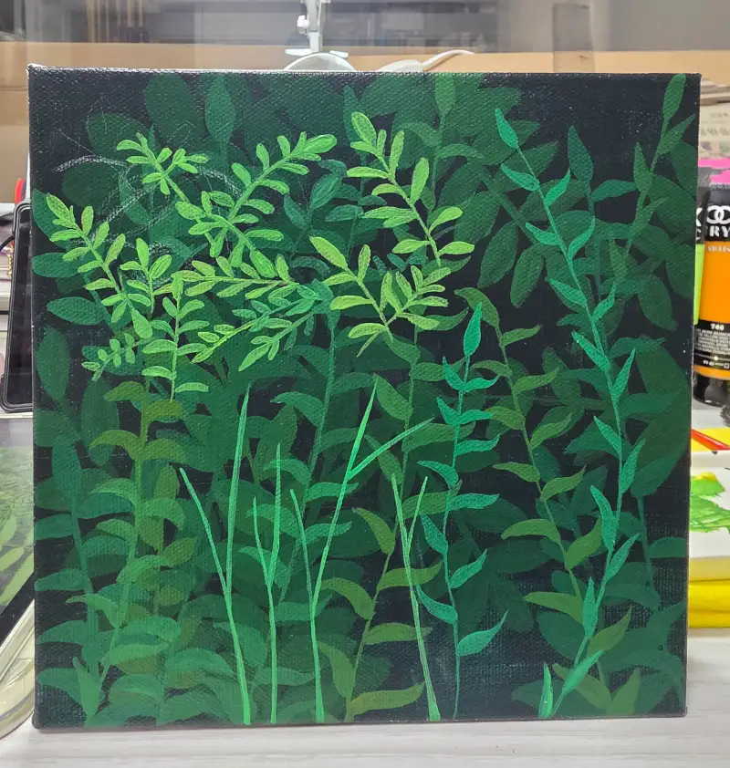 그리고 다크한 그린색을 바탕전체를 칠하고 밝은 그린색을 만들어 잎을 올렸습니다. 맨 나중에 꽃을 그려서 완성했습니다.