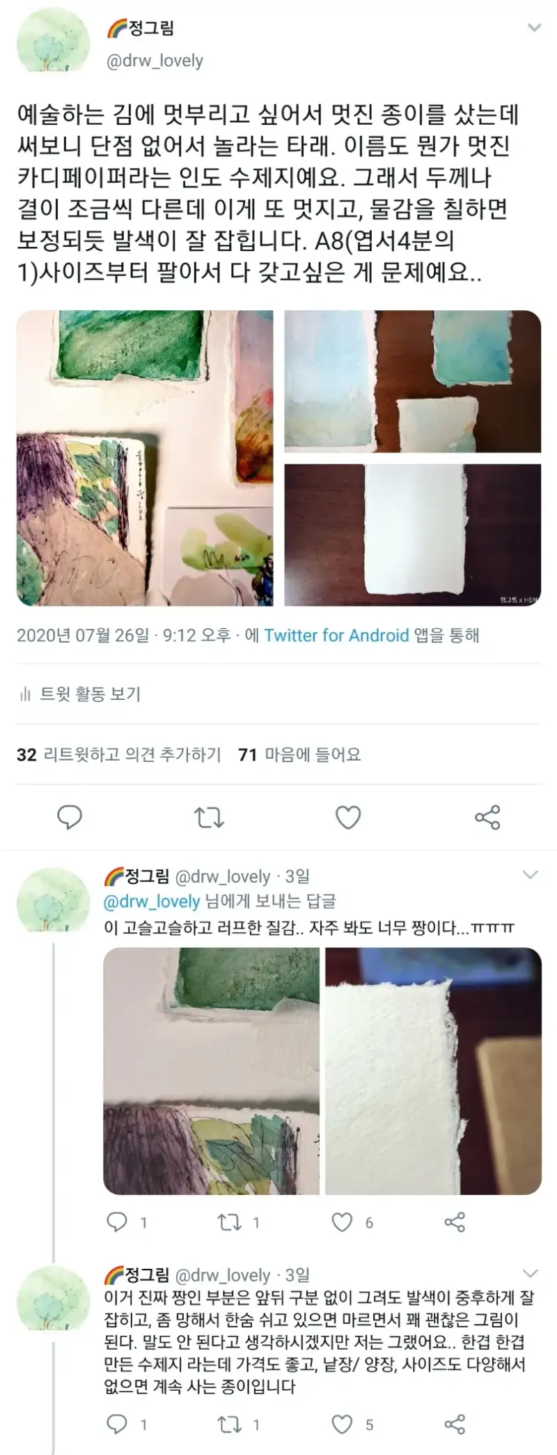 종이 욕심이 없다가도, 고슬고슬한 질감과 테두리의 나풀나풀함을 보면 종류별로 사지 않을 수가 없는...