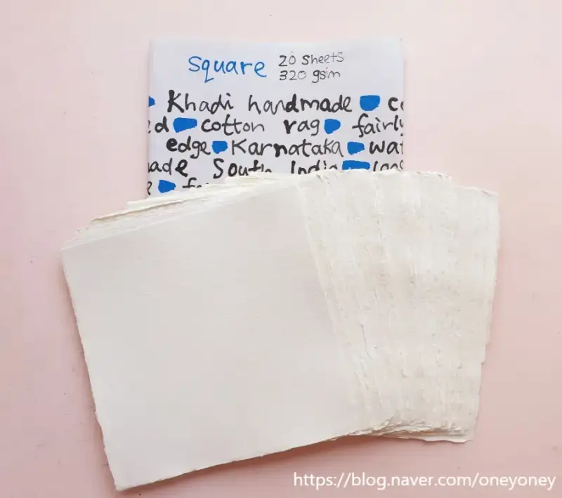 실물로 보시면 단박에 느끼실 수 있겠지만 끝 마무리가 깔끔하게 잘려진 형태가 아닌 정통방식으로 종이를 한장 한 장 만들어내는 식이라 핸드메이드 느낌이 물씬 느껴집니다. 게다가 직사각형 형태가 아닌 정방형이라 귀여운(?) 느낌이 강합니다. 물론 다른 옵션으로 직사각형태도 구매 가능합니다.