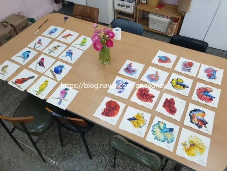 어떤 걸 그릴까 하다 베타 물고기와 다양한 새들을 그렸는데요,