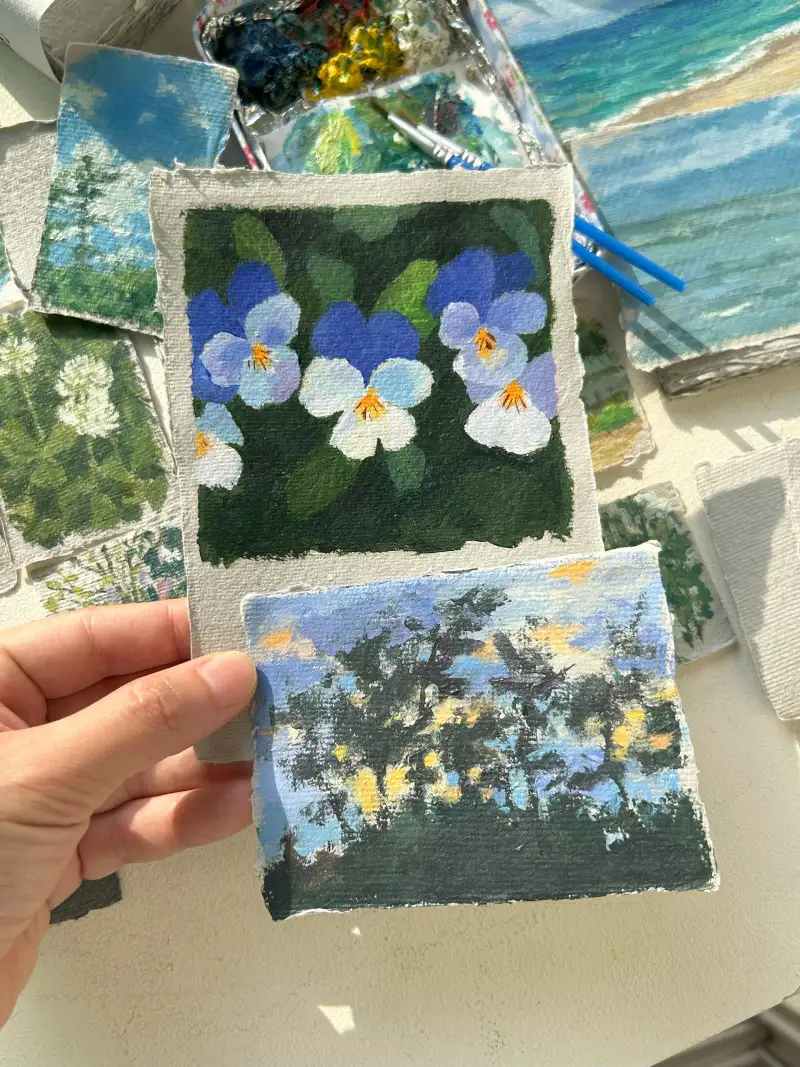 아크릴 물감을 사용하여 조금 더 큰 사이즈에 팬지꽃과 해질녁 풍경을 그려보았습니다.