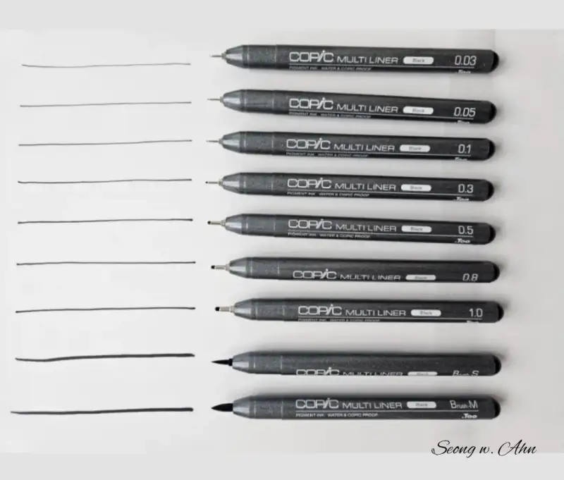 코픽 일회용 멀티라이너 블랙 9본 세트에는 0.03mm부터 1.0mm까지 두께의 일곱가지 멀티라이너와 두가지 붓펜이 들어있어요.