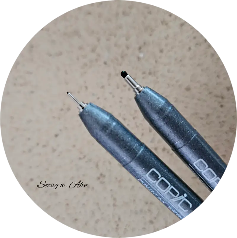 코픽 잉크야 검증된 것이니 발색과 부드러움은 두말 할 필요가 없습니다. 부드러운 터치감과 진한 안료의 색, 종이에 닿는 느낌이 아주 좋습니다.