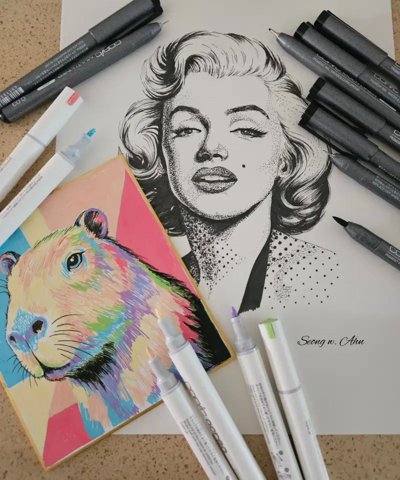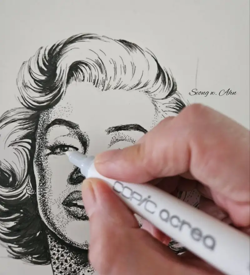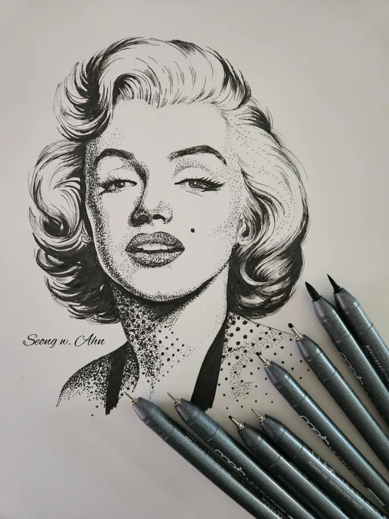 9가지 다양한 종류의 펜으로 마를린 몬로를 완성해봤습니다.