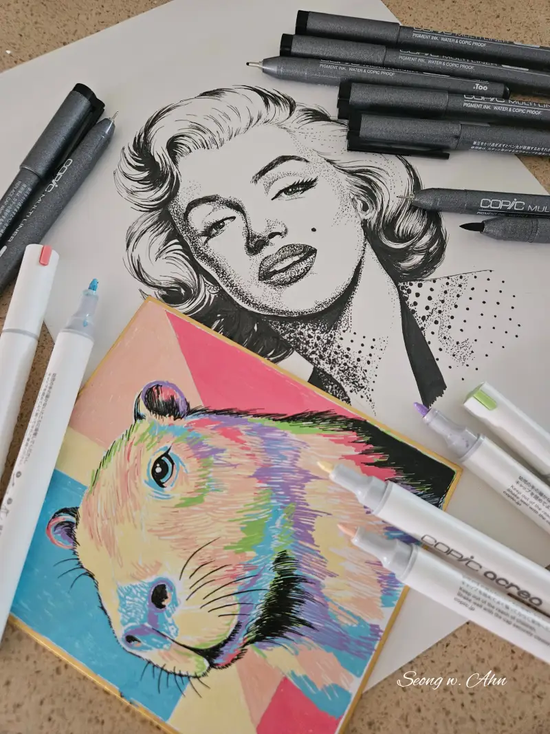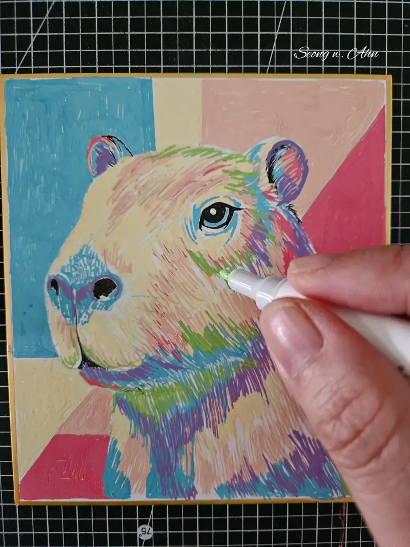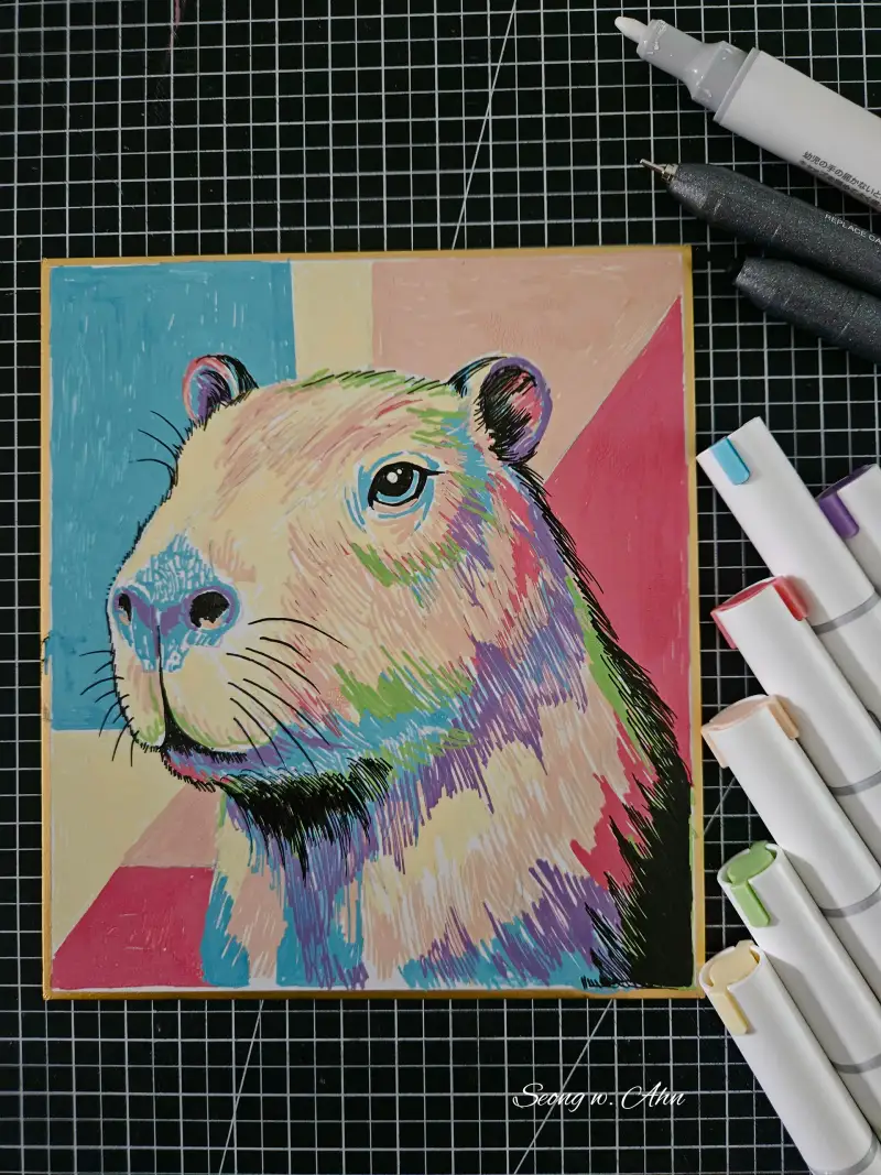 코픽 아크리아 아크릴 마카 6색 세트와 코픽 일회용 멀티라이너 블랙으로 카피바라를 완성했습니다.