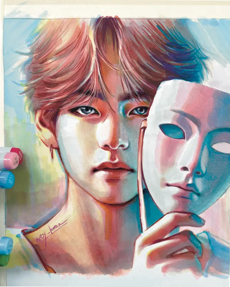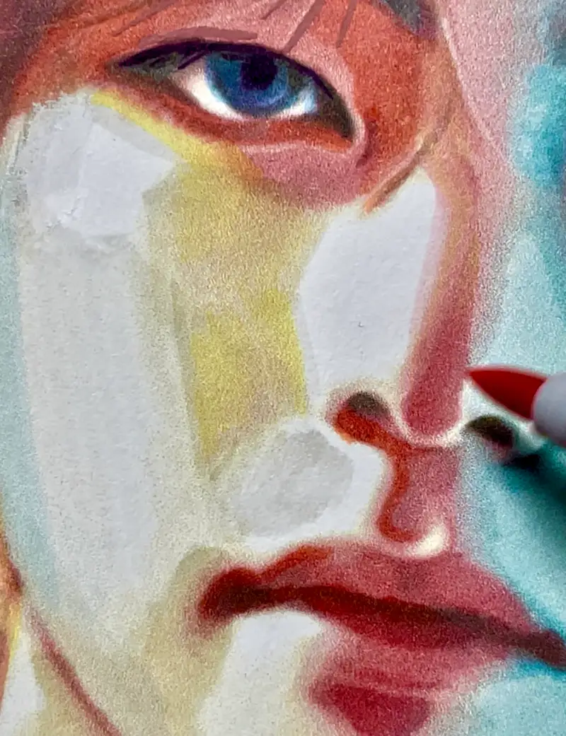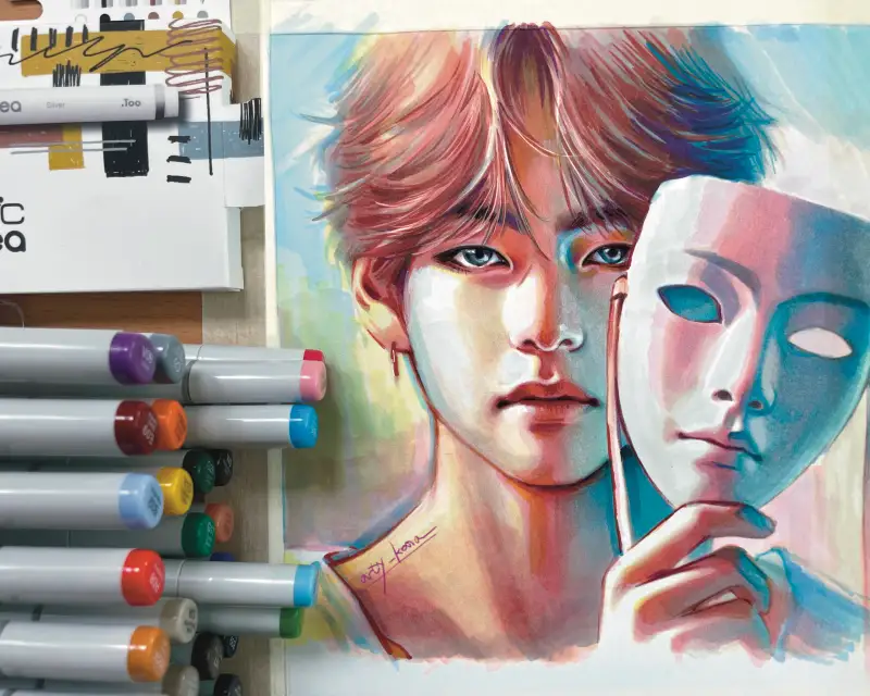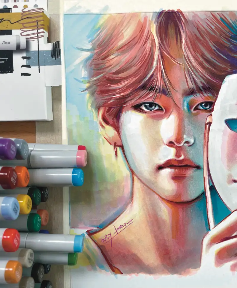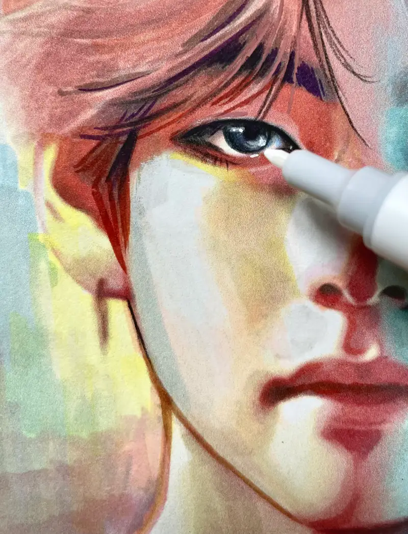 이번 인물화 작업에서는 마카 특유의 레이어링과 색 분리감을 활용하는 방법에 중점을 두었습니다.