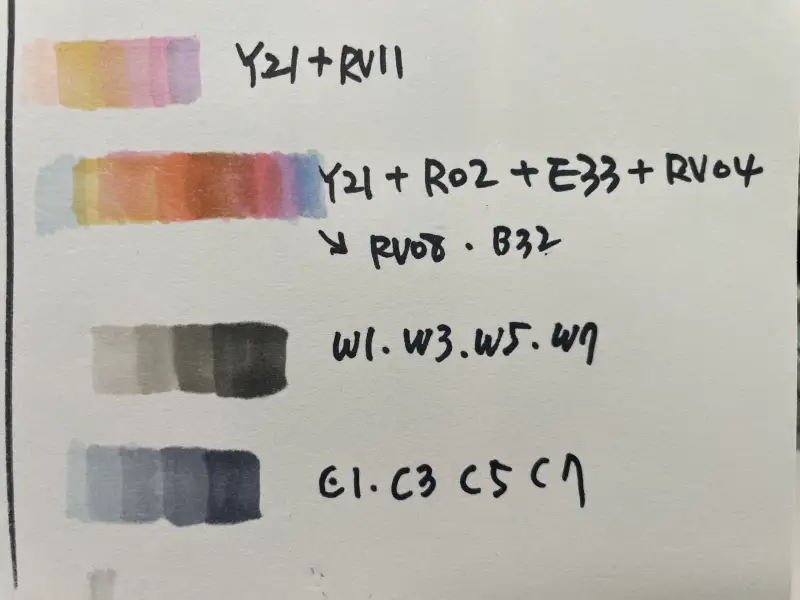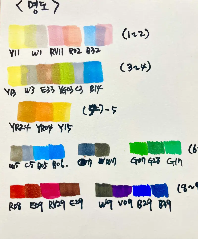 특히 밝은 색(Y11, RV11 등)을 먼저 깔고, 어두운 색을 덧칠해 명도 질서를 정리하면, 단독으로는 튀는 색들도 서로 겹쳐 쓸 때 의외로 조화로운 결과를 보여주더라고요.
