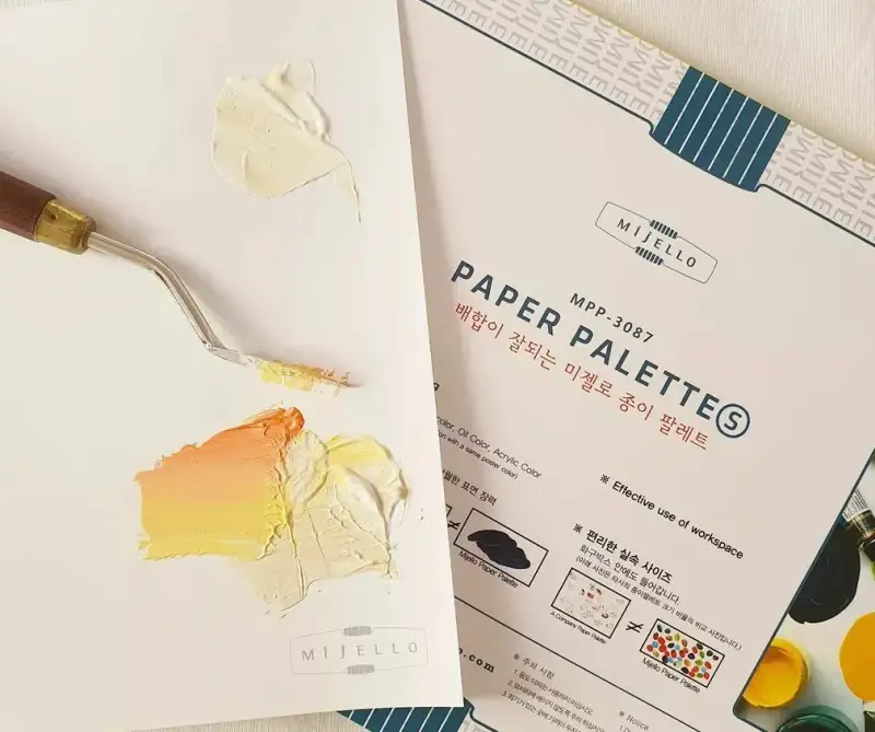 30cm가 안되는 사이즈의 종이 파렛트예요. 저는 (특히 크지 않은 그림을 그릴 때) 컴팩트한 화구를 선호해서 작업 공간을 많이 차지하지 않는 사이즈를 찾게 되었어요. 작은 크기와 비율이 테이블에 놓고 쓰기 좋아 아주 마음에 들었습니다. a4정도 되는 것만 사용했어서 더더 간편하고 좋더라구요!