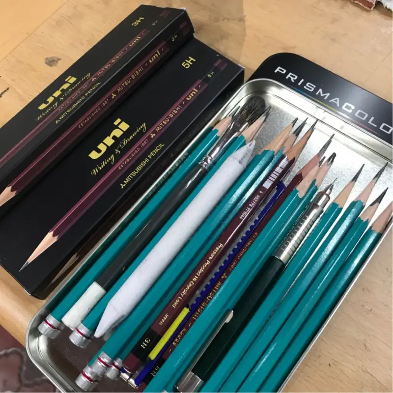 Mitsubishi pencils - 미쓰비씨제품은 3H , 5H를 구매해서 사용하게 되었습니다. 기존에 미쓰비씨를 사용하시던 작가님들을 보고 구매하게되었으며 작가분들께서도 B계열보다는 H계열에 사용이 많아서 무슨이유가 있을까해서 구매를 하게되었습니다. B계열을 사용하지는 않았지만 H계열을 주로 사용하는 작가들이 왜 미쓰비씨 제품을 사용하는지에 알수 있었습니다. H계열에 하드함도 가지고 있지만 부드러운 흑연으로 인해서 중간톤 묘사와 세부정리를 하는데 탁월한 제품임을 알수 있었습니다. 타제품과 다르게 독특한 부드러움과 중간톤 작업에 큰 장점을 가지고 요번작품을 진행하면서 명암간 중간 정리를 샤프로 진행했었는데 요번에는 미쓰비씨제품에 비율이 높게 사용해서 작업할수 있었습니다.