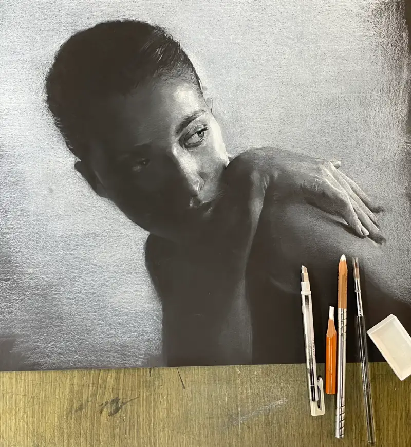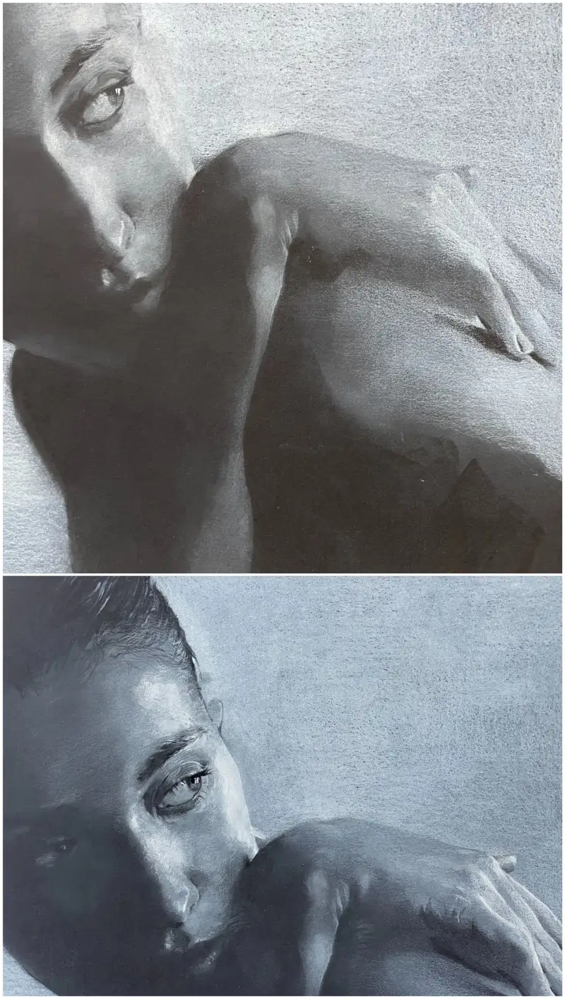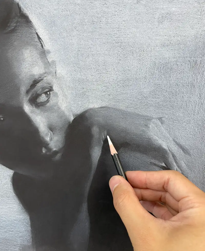 요즘 인체 표현에 능숙한 분들은 미색이 있는 종이를 선택해 빛과 화이트포인트를 너무 잘 활용하시는것 같아요. 저는 조금 극단적이지만 어둠이 존재하고 빛을 이용해 입체를 형성하는 작업을 해보았습니다. 익숙하지 않은 진행의 과정을 남기고 갑니다.