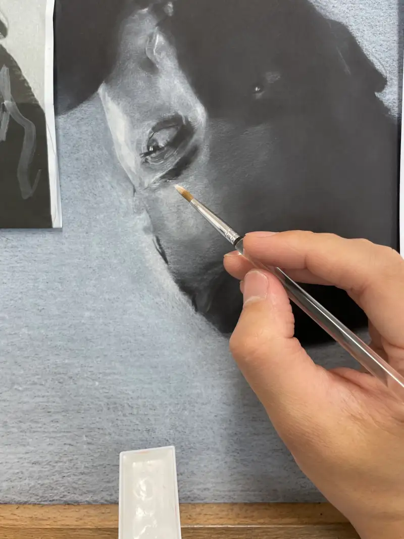 종이의 두께가 얇고 색상이 완전한 블랙이 아니다 보니 더웬트 크로마플로우 블랙 화이트 색연필을 곁들여 사용했습니다. 또한 압축목탄과 연필콘테 역시 톤의 중첩과정에서 하이라이트 표현이 부족하여 길상에서 제공받은 안채 고체물감 화이트색상을 함께 사용했어요.  연필은 기름성분으로 물이 번지지만 콘테와 압축목탄은 수성색체도 잘 올라갑니다(조금의 번짐이 있으니 물을 조금만 사용하세요). 너무 좋은 재료들 덕에 잘 해결해 나갈 수 있었습니다.
