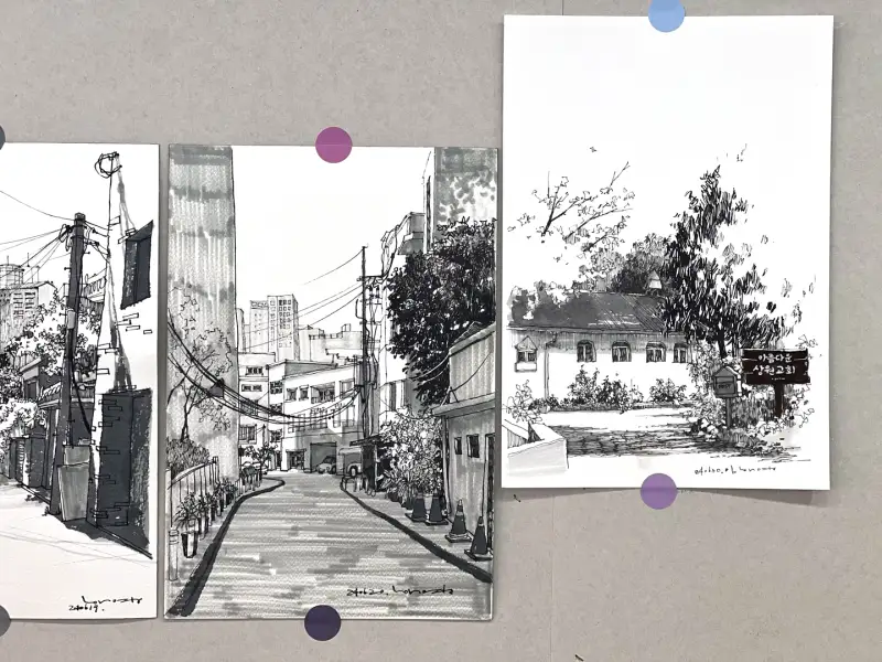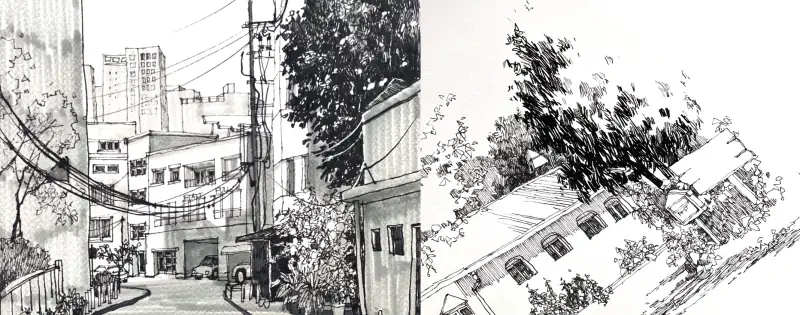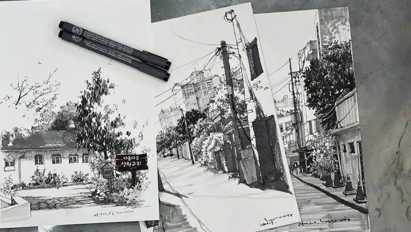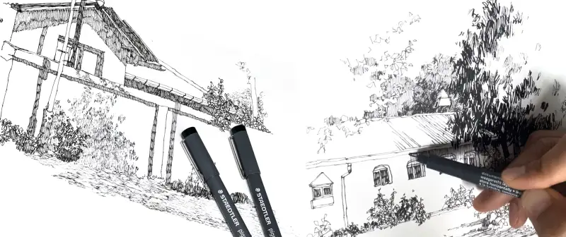 섬세한 표현부터 강약조절까지 , 원근감을 위해 여러가지 굵기의 펜을 사용합니다.