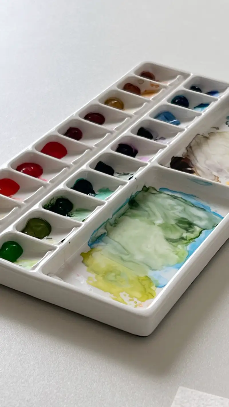 🙂↕️ 한가지 살짝 아쉬웠던건 뚜껑이 없다는 사실..! 제 공간엔 고양이들도 함께 생활하고 있어 먼지 + 고양이털이 물감에 잘 붙는데 뚜껑마저 없어 그게 조금 불편했어요. 하지만 제가 구매한 이후에 뚜껑있는 다른 디자인의 도자기 팔레트도 나왔다는 사실...! 저처럼 불편하다 느끼시지만 감성을 포기할 수 없는 분들은 꼭 뚜껑있는 버전을 구매하세요!😎