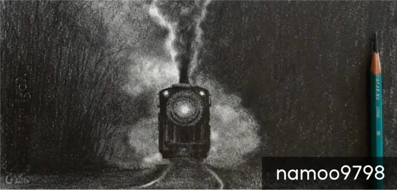 기차,연기,나무,기찻길,소묘,흑연