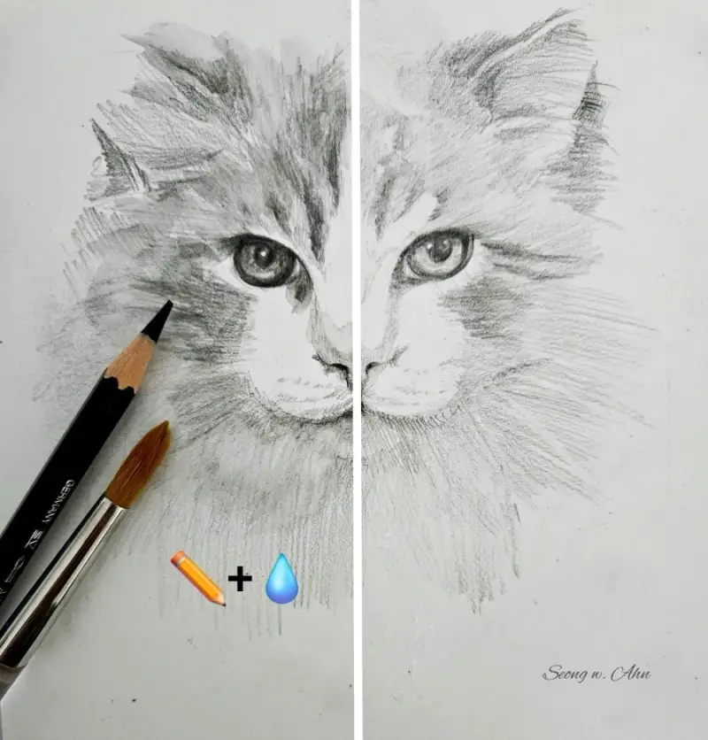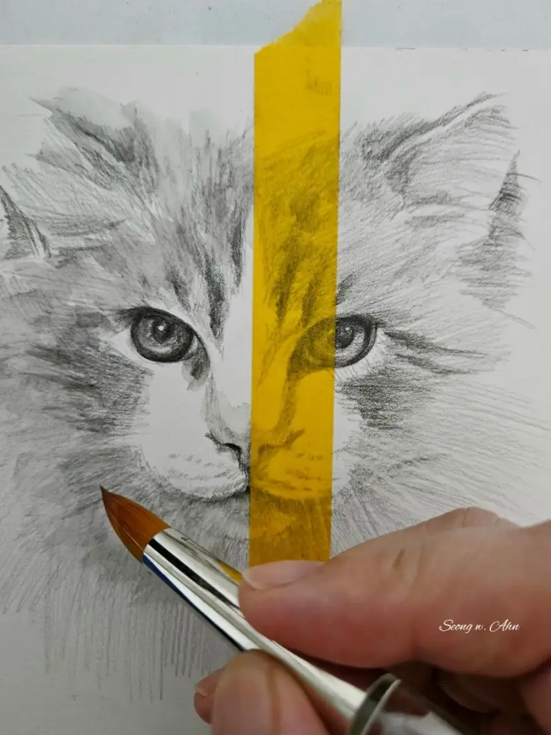 물칠이 가능한 스케치북이니 아쿠아 연필로 그려보고 반만 물칠을 해 비교해 볼게요.