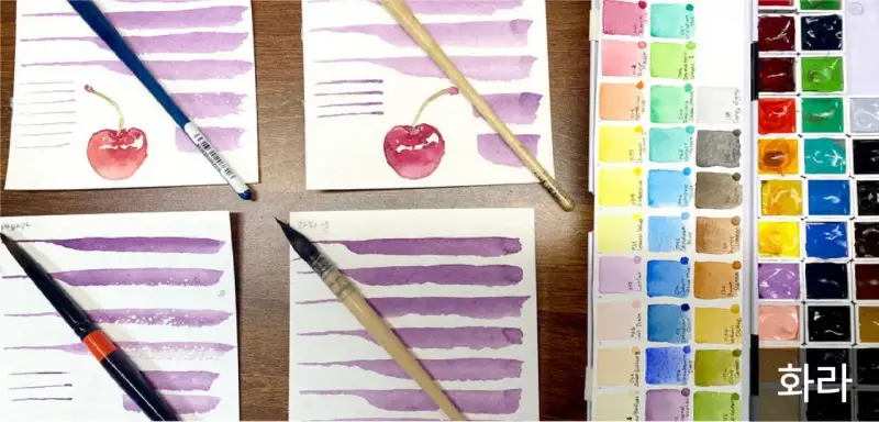 그래서 제가 갖고있는 수채화 붓들을 비교하는 포스팅을 만들어 보았어요.수채화 붓 구매 하실때 참고가 되셨으면 좋겠습니다. (개인적인 의견이 매우~ 포함되어 있으니..양해바랍니다)물감은 홀베인물감을 사용하였구요. 종이는 파브리아노 수채화지(황목)에 테스트 했습니다.붓은 왼쪽부터 라파엘, 이사베이, 바바라, 홀베인.테스트는 물머금 정도, 얇기에서 굵기 표현, 체리그리기로 진행해 보았어요.