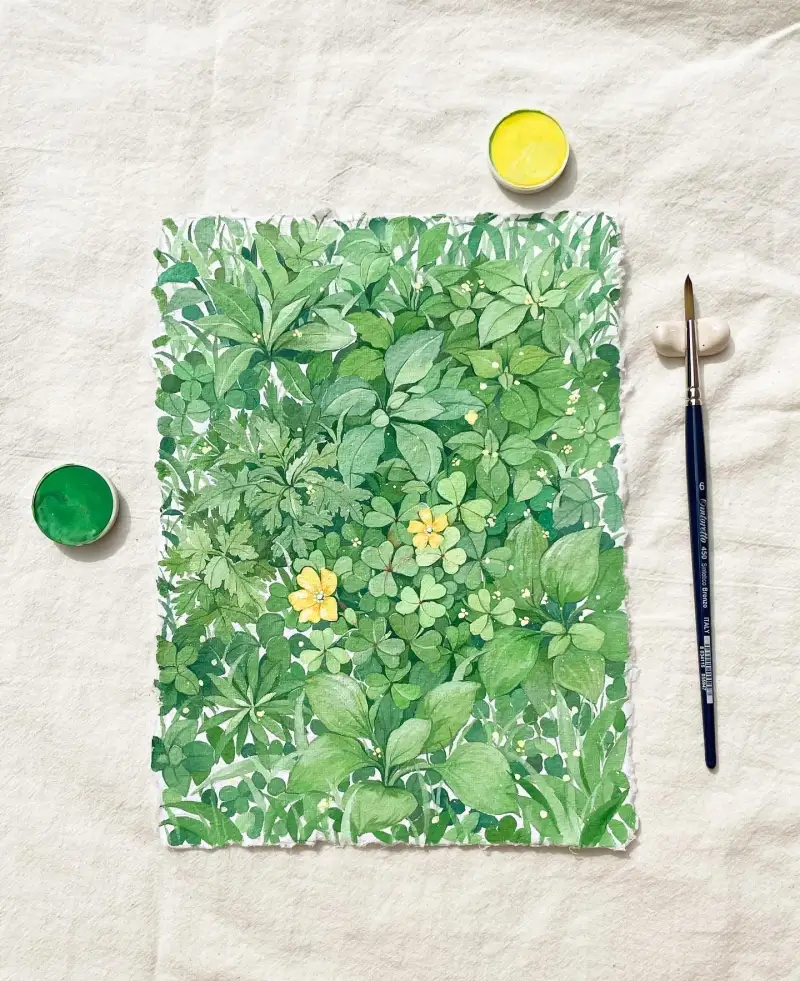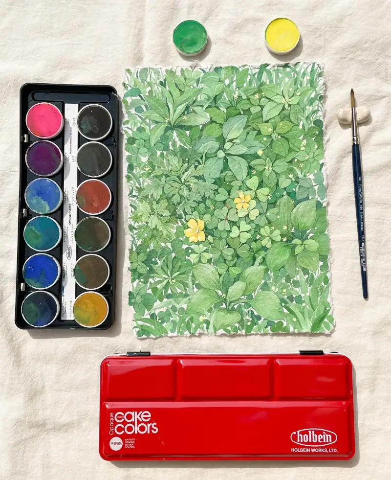 고체물감 중에 잘 안녹아나는 물감 가끔 있죠... 붓이 닳아버릴 것 같은 기분이 드는 ... 안 녹아나는 물감과 차원이 달라요. 물감이 진하게 잘 녹아나와요. 그리고 꽤 많이 썼는데도 아직도 양이 한참 남았더라고요! 저는 물을 많이 타서 투명 수채화로도 많이 썼습니다. 투명, 불투명 둘 다 손색없이 사용이 가능합니다. 평소에 연하게 사용하면서 습작용으로 많이 썼고요. 불투명으로 과슈처럼 사용 했습니다. 화이트를 섞어서 파스텔 톤으로 진하게 사용하면 깔끔하게 표현이 됩니다.