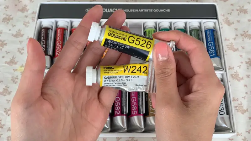 수채물감 튜브와 비교해 보았는데, 수채과슈는 색 번호가 G로 시작하는 것이 특징이고