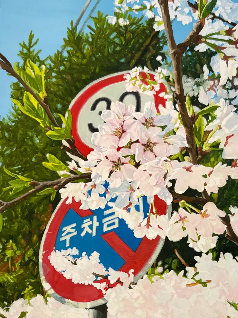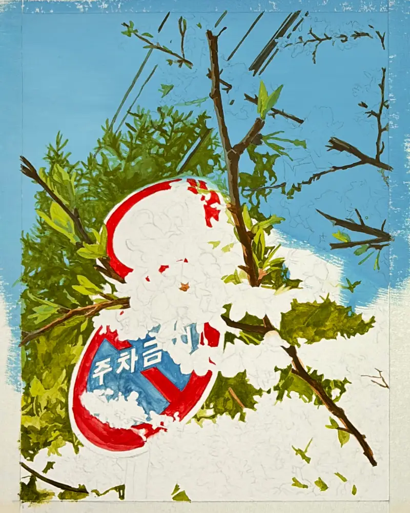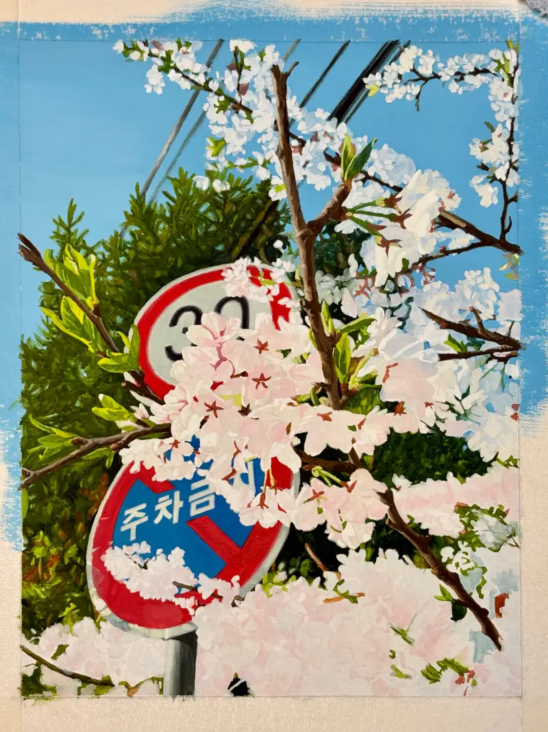 제가 오래 전 찍어둔 벚꽃이 있는 풍경 사진을 소재로 정하고 그리기 시작했는데,