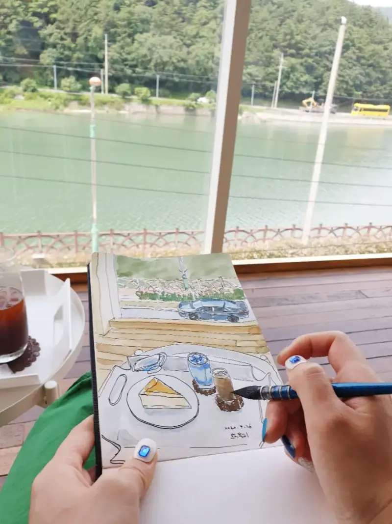 그리고 홀베인 블랙 리세이블 붓 하나면 넓은 부분이든 가는 부분이든 채색이 가능 하기때문에 1호붓 하나만 챙기구요. 카페에서 그려봤는데 별 무리 없이 진행 가능 했습니다.