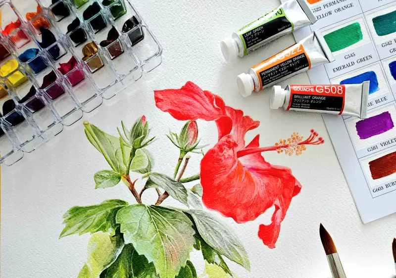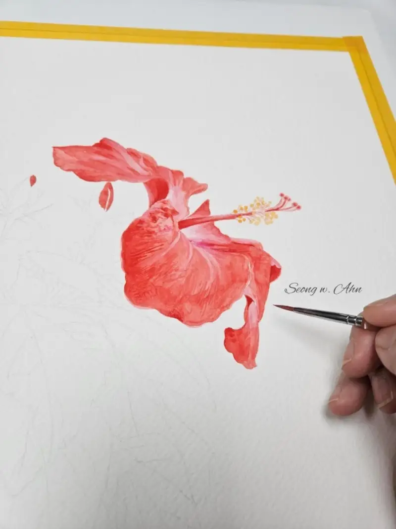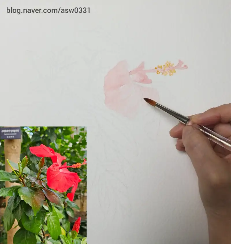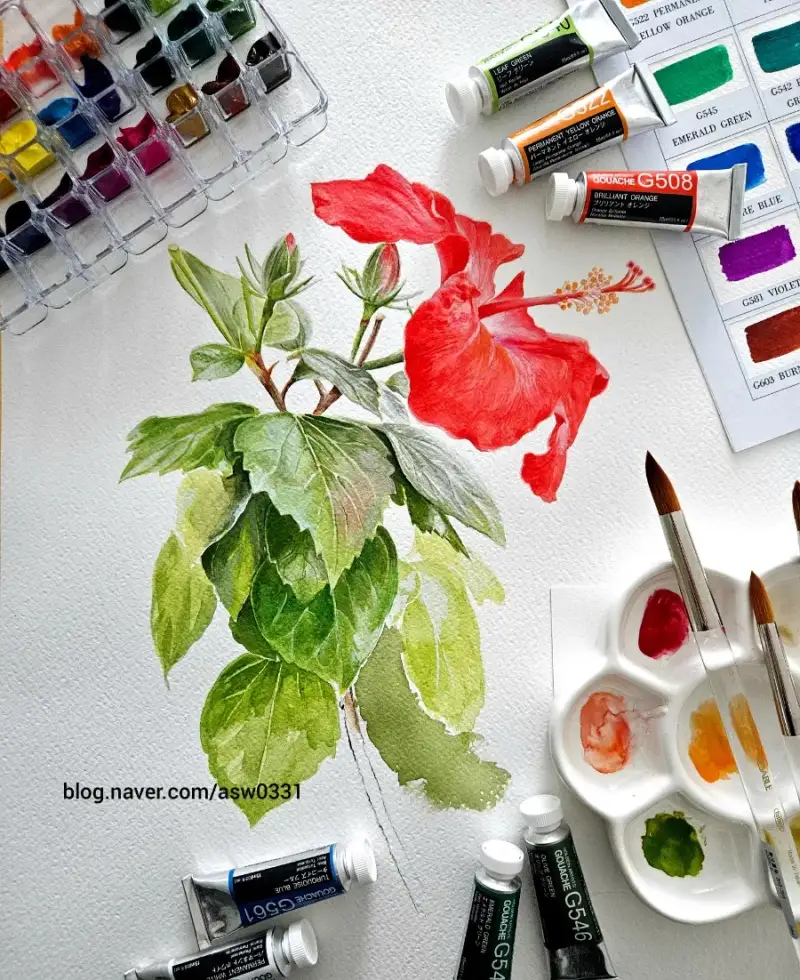 홀베인 아티스트 수채화 과슈 15ml 24색과 500R 리세이블 수채화붓으로 서울식물원에서 찍은 <레드 히비스커스>를 그려보았습니다.