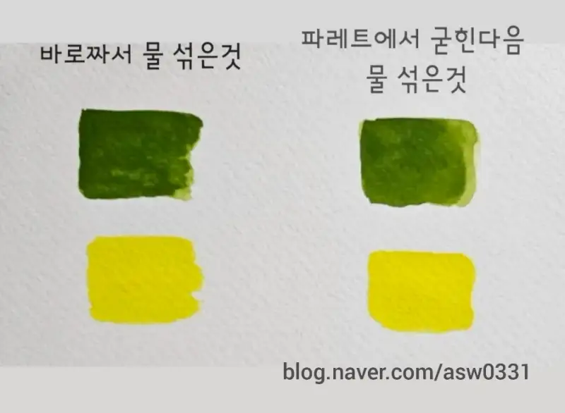 바로 짠것과 물을 섞은걸 비교해볼게요. 굳히고나서 물을 많이 섞어서 칠한건 바로 짠 색보다 탁해진걸 알 수 있습니다.
