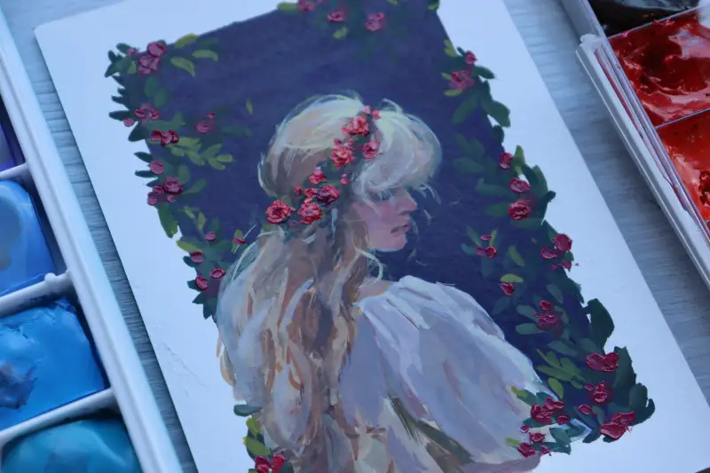 특이한 점은 매트하게 마무리 되는 보통의 과슈들과는 다르게 물감의 농도나 두께에 따라 마르면서 광택이 생기는 부분이 있었고 건조가 굉장히 빠르다고 느꼈어요. 미야 젤리 과슈로 그렸던 그림과 비교해보니 광택 때문에 전체적으로 빛 반사가 있는게 바로 보였어요.