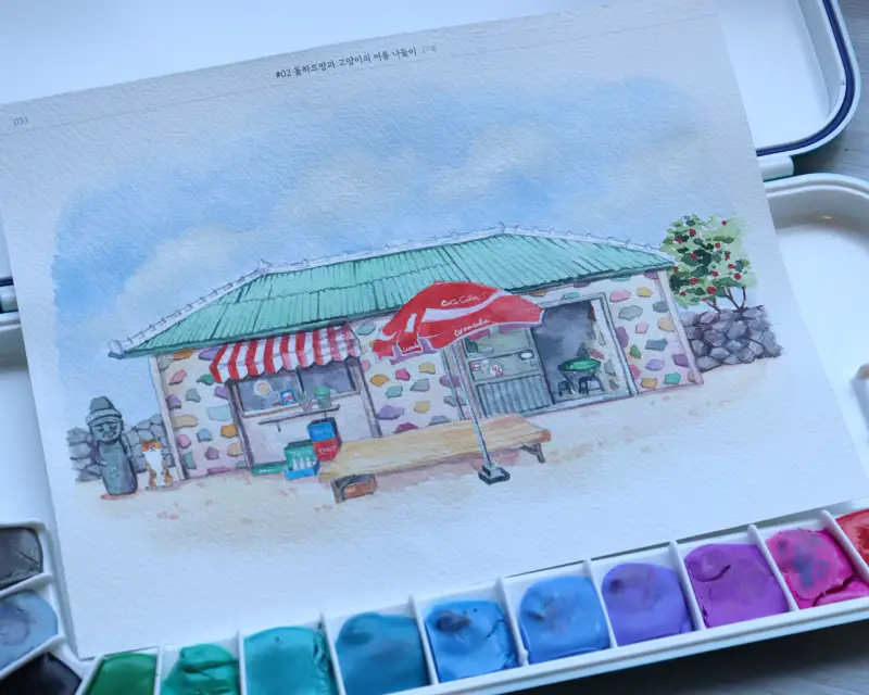 굳혀서 사용하는 것보다 필요할 때마다 조금씩 짜서 바로 사용했을 때 은폐력이 더 좋았어요. 파라솔 위 글씨는 화이트를 그대로 찍어 불투명하게, 구름은 물을 섞어 자연스럽게 표현해 주었어요.