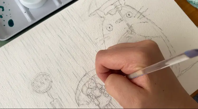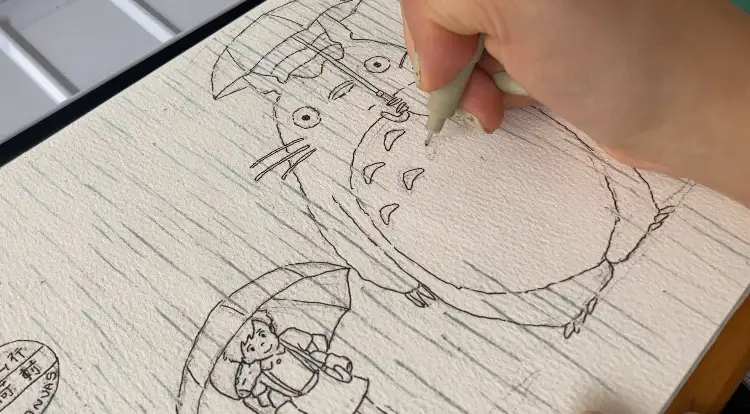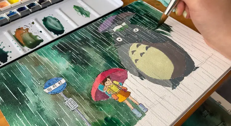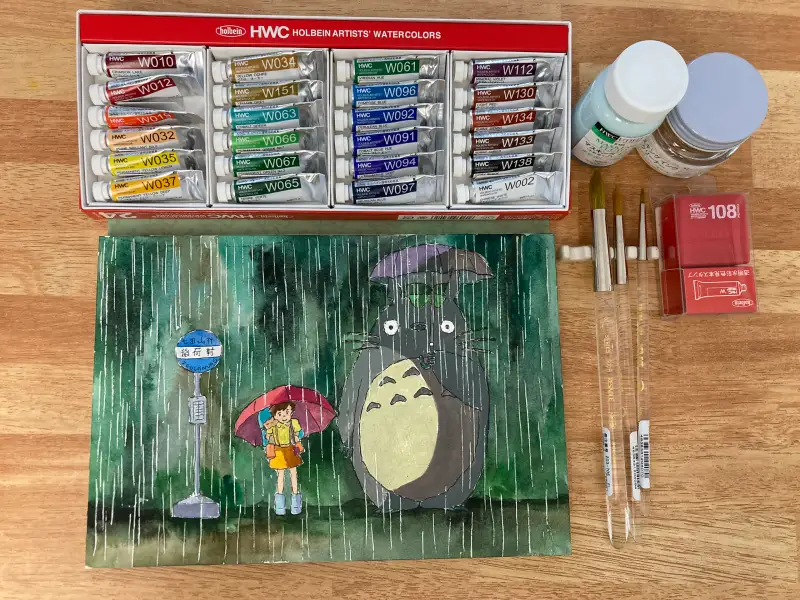 이번에는 홀베인 수채화 물감과 마스킹 잉크를 사용해서 이웃집 토토로의 한 장면을 그려봤습니다.