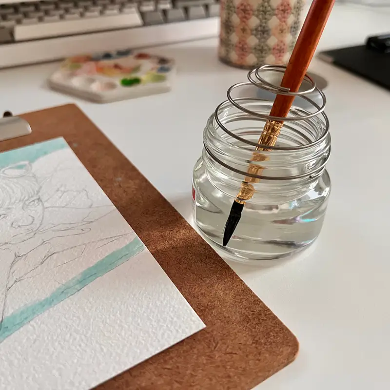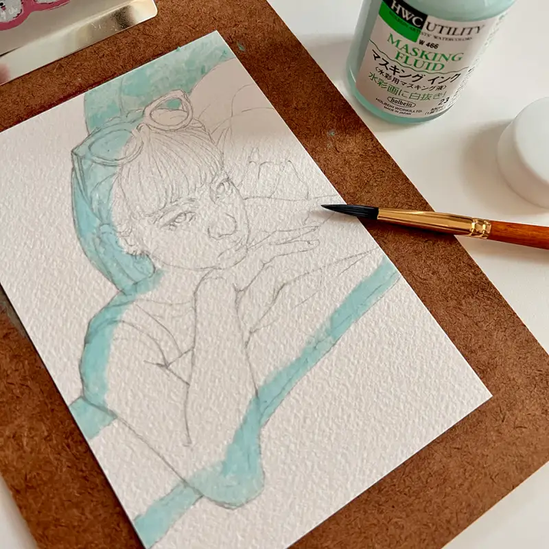 마스킹 잉크가 충분히 건조된 후 물감을 올리고 또 떼어내야 하지만 종이에 도포 후 2주가 지나면 떼어내기가 어렵다고 합니다.