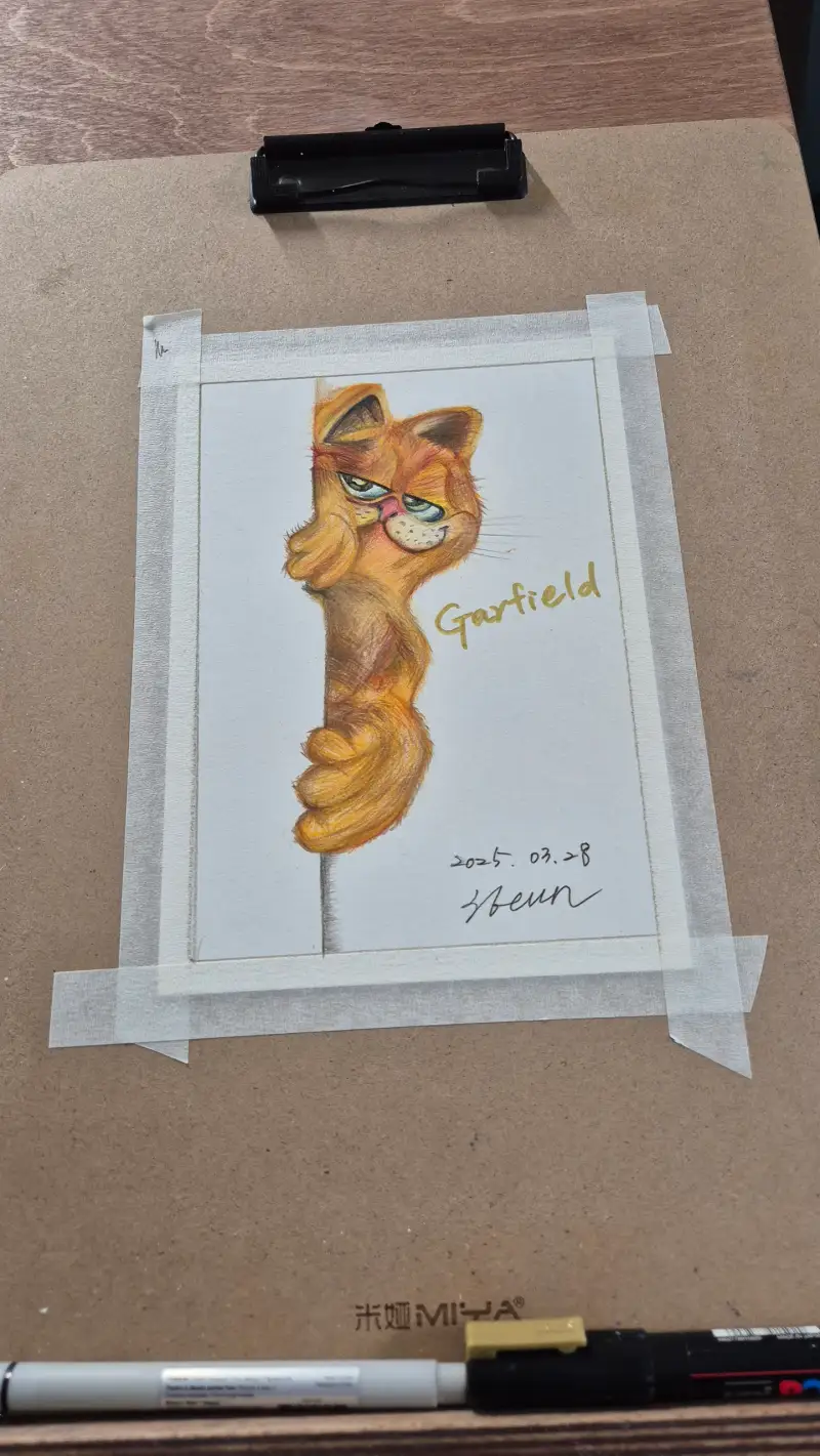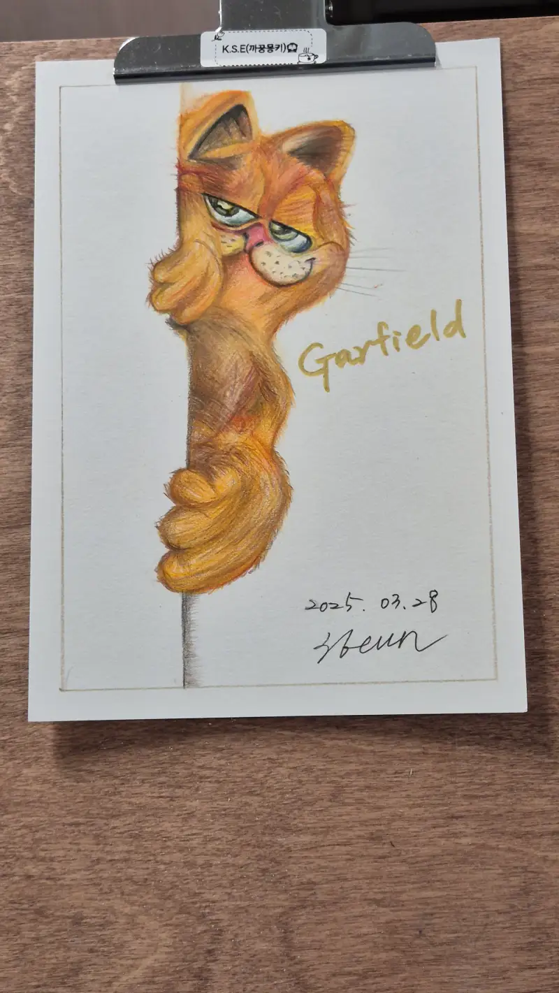 스케치 후 떡지우개로 지워서 연하게 만든 다음 작업했습니다. 고양이는 좋아하지 않는데 가필드는 예외입니다. 시니컬하고 독불장군 같은 게 가장 큰 매력이죠~ ㅋㅋ 동물 털 표현하기란 참 어려워요. 많이 연습 해야겠습니다. 중간에 갈기갈기 찢어버리고 싶은 충동을 참고 어떻게든 특징을 살려보잔 생각으로 완성했습죠~
