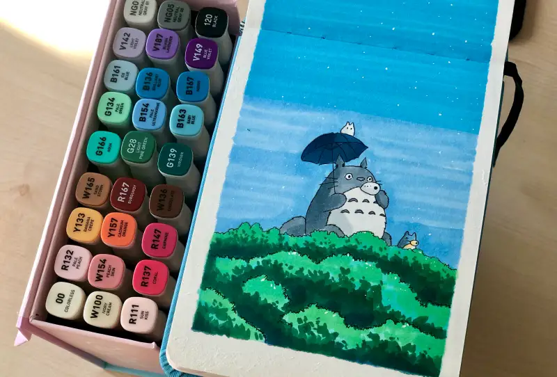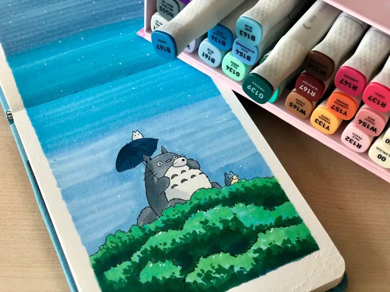 첫 그림으로 토토로를 그려보았습니다. 마카색상을 서로 여러번 반복해서 색울 섞어주니 그라데이션 밤하늘이 완성 되었어요!!