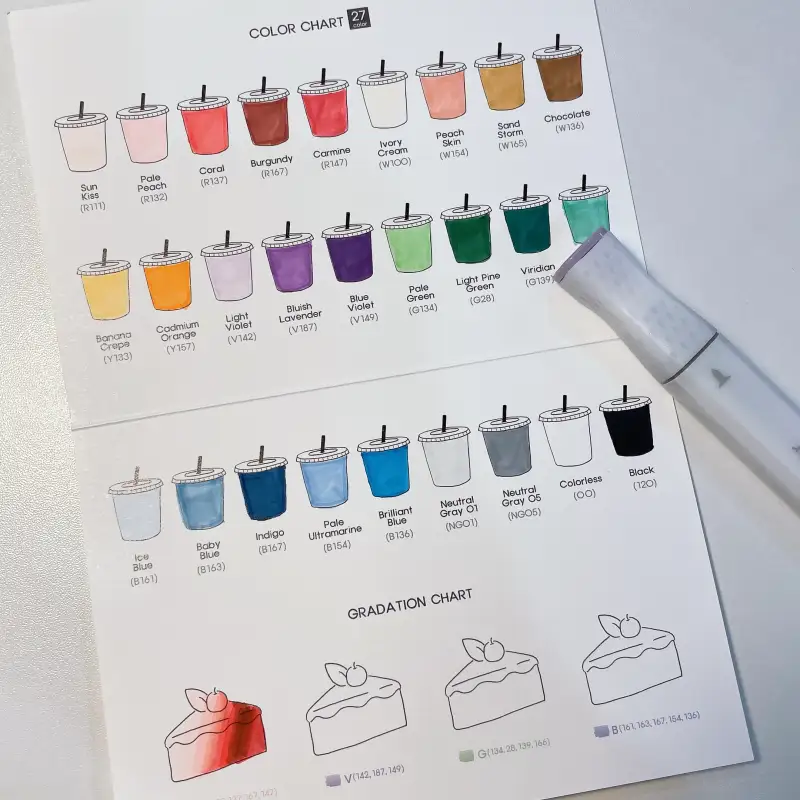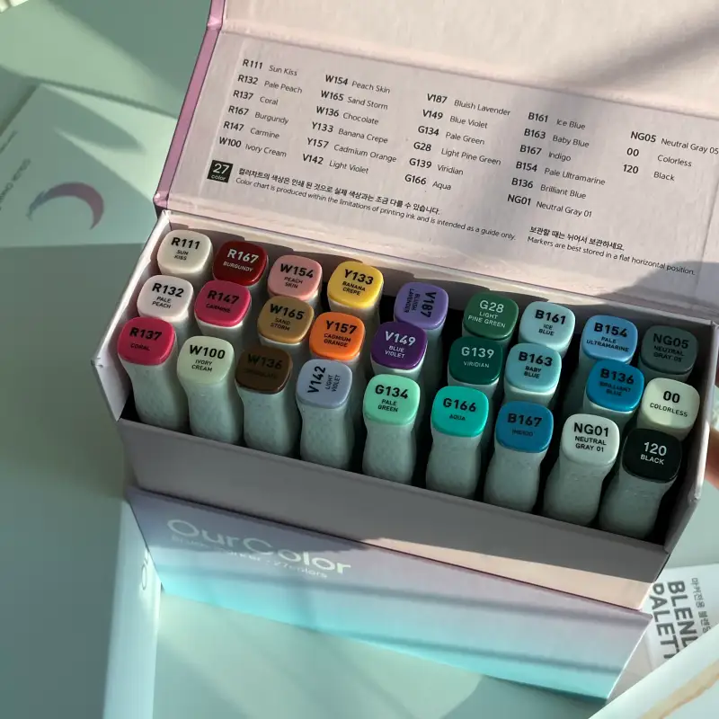 모든색이 자연스럽게 그라데이션 되며 연결되고 어색한 중간톤은 마카종이팔레트에 섞어서 사용하면 되니 27색이여도 만들 수 있는 색은 그 이상이예요! 만들기 나름👍🏻
