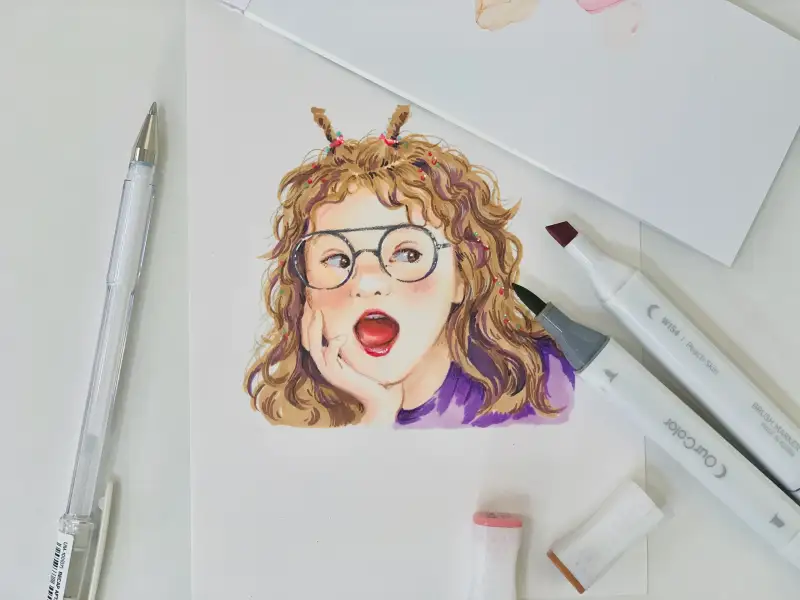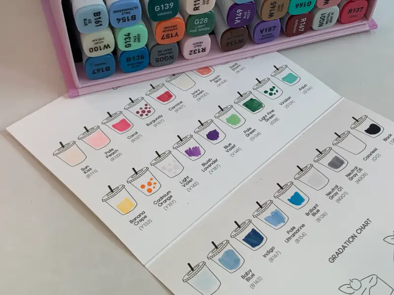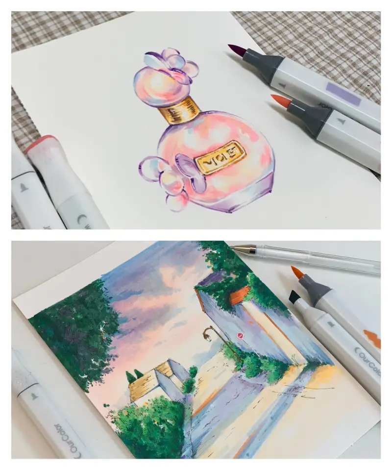 음료나 디저트 형태의 모양으로 칠해가며 귀여운 컬러차트를 만들 수 있고,일러스트가 그려진 종이에는 간단하게 채색해가며 골드손 아워컬러 마카를 경험해 볼 수 있기도해요