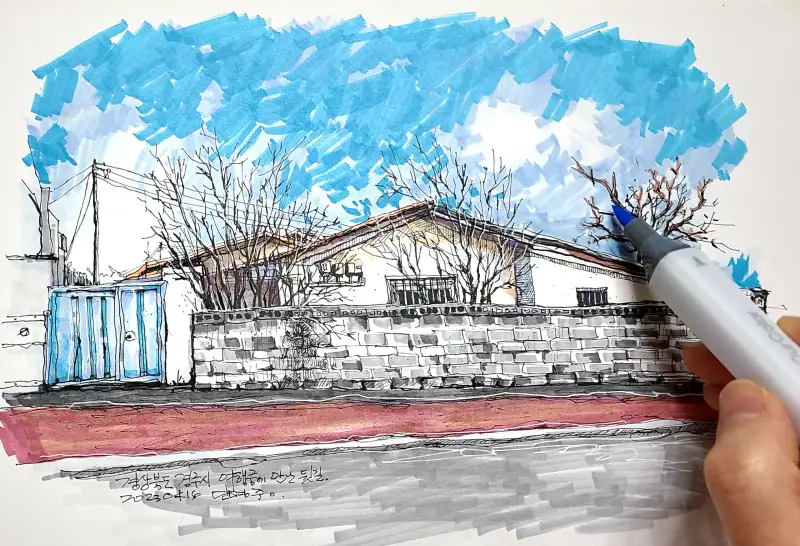 파란하늘 어반스케치그리는 과정 궁금하다면