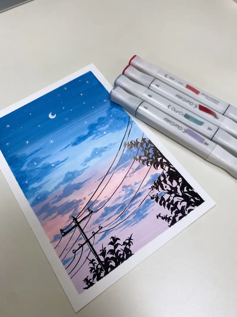 마카의 라이트 톤으로 배경을 먼저 칠해주고, 미드 톤으로 구름을 그려줬어요.
